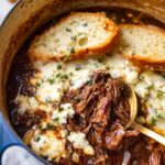This French Onion Pot Roast is a comforting, flavorful dish featuring a tender, slow-braised chuck roast cooked with caramelized onions, garlic, wine, and aromatic herbs. Finished with melted Gruyere cheese, it’s perfect served over mashed potatoes or with toasted baguette slices for a hearty meal.