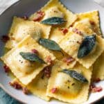 9. Serve: Plate the cooked ravioli, spoon sage butter over the top, sprinkle with crispy sage leaves, pancetta, and grated Parmesan cheese. Serve immediately for best flavor and texture.