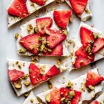 This Frozen Yogurt Bark is a refreshing and healthy treat perfect for hot days. Made with creamy vanilla yogurt, fresh sliced strawberries, and crunchy pistachios or your choice of nuts or granola, it’s an easy-to-make dessert that offers a delightful combination of sweet, tart, and nutty flavors. With minimal ingredients and no cooking required, it’s a kid-friendly snack that serves as a satisfying alternative to ice cream.