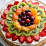 This colorful Fruit Pizza features a soft sugar cookie crust topped with a thick, tangy cream cheese frosting and a vibrant assortment of fresh fruit. It’s a delightful summertime dessert that’s easy to customize with your favorite fruits, perfect for serving 10-12 people at gatherings or parties.
