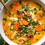 This Healing Ginger Coconut Chicken Brown Rice Soup is a nourishing one-pot meal featuring tender chicken thighs simmered with fresh ginger, turmeric, garlic, and carrots in a flavorful coconut-infused broth. Brown rice adds wholesome whole grains, and the vibrant soup is topped with fresh herbs and crunchy roasted peanuts for a delightful texture. Perfect for colder months, this comforting soup combines anti-inflammatory ingredients with creamy coconut milk for a soothing, feel-good dish.