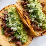 - Assemble the Tacos: Place slices of grilled steak onto each tortilla. Top with avocado salsa, grilled green onions, and a sprinkle of finely chopped white onion and remaining cilantro. Add extra lime juice or salt if desired.