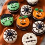 Get creative by piping the colorful frostings in different spooky patterns. I usually do five designs like spider webs with melted chocolate drizzle, monster faces with M&Ms as eyes, pumpkins with orange frosting and green stems, ghost shapes with white frosting (reserve a bit before coloring), and simple black-topped cupcakes for a witchy feel. These look impressive, but they’re super easy once you get the hang of it!