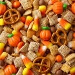 If you want to make it way ahead of time, you can freeze the mix (without the candy) in an airtight freezer bag. When ready to eat, thaw completely and then toss in your candy corn and Reese’s Pieces. This keeps the candy fresh and prevents melting.