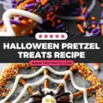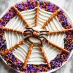 Halloween Pretzel Treats featuring candy spiderwebs are a fun, festive snack perfect for parties and family activities. These sweet and salty treats combine crunchy pretzels with creamy vanilla white chocolate candy coating, decorated with colorful Halloween sprinkles and detailed spider designs made from melted chocolate chips.