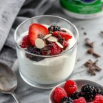 A quick and healthy Greek Yogurt Berry Parfait featuring creamy 2% Greek yogurt layered with fresh mixed berries and topped with crunchy sliced almonds, granola, and dark chocolate shavings. Perfect as a nutritious breakfast, snack, or light dessert.