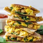 A delicious and nutritious vegetarian breakfast quesadilla filled with scrambled eggs, sautéed spinach, white beans, and melted cheese, all wrapped in whole wheat tortillas. Perfect for a hearty morning meal or meal prep.