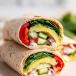 This Veggie Wrap with Hummus is a quick, healthy, and delicious lunch option featuring whole wheat tortillas filled with creamy hummus, fresh baby spinach, crisp cucumber, sweet roasted red peppers, creamy avocado, crunchy red onion, and tangy feta cheese, seasoned with freshly ground black pepper. Perfect for a nutritious meal on the go or a light meal.
