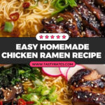 This Easy Homemade Chicken Ramen recipe offers a savory, authentic Japanese-style bowl of noodles packed with rich chicken broth, tender marinated chicken thighs, shiitake mushrooms, fresh Asian greens, and perfectly cooked ramen eggs. The broth combines soy sauces, mirin, garlic, ginger, and chili to create a complex, flavorful soup base. Ideal for a comforting weeknight dinner, this recipe balances savory, sweet, and spicy notes with a satisfying texture from fresh noodles and crisp vegetables.