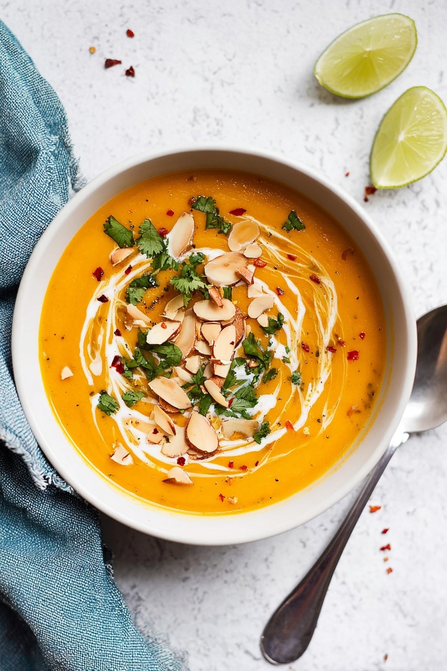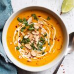 - Serve and Garnish: Divide the soup into bowls and garnish with roasted sliced almonds or peanuts, chopped cilantro, red chili flakes, and an extra drizzle of coconut milk if desired.