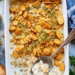 - The buttery Ritz cracker topping adds a lovely crunch and golden finish to the casserole.