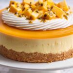 Just before serving, whip the remaining cream with sugar and vanilla extract until soft peaks form. Spread or pipe it generously over the set cheesecake. I love topping mine with fresh mango cubes and a few passionfruit halves – the tart passionfruit seeds brighten it up and add a pop of color that’s as tasty as it is pretty.