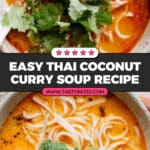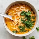 A comforting Northern-Style Thai Coconut Soup featuring aromatic red curry, creamy coconut milk, and tender rice noodles. This savory soup combines vibrant spices and fresh cilantro, perfect for a flavorful and satisfying meal.