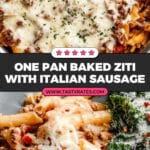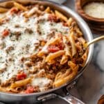This One Pan Baked Ziti is a quick and comforting Italian-American classic made all in one skillet. Ground Italian sausage simmers with diced tomatoes, tomato sauce, herbs, garlic, and pasta, then finished with creamy half and half, parmesan, and melted mozzarella cheese. Ready in under 40 minutes, it’s perfect for an easy weeknight dinner with minimal cleanup.