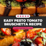 A fresh and flavorful Pesto Tomato Bruschetta recipe featuring crisp baguette slices topped with aromatic basil pesto, juicy cherry tomatoes, and a drizzle of sweet balsamic glaze. Perfect as an appetizer or snack.
