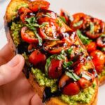 A fresh and flavorful Pesto Tomato Bruschetta recipe featuring crisp baguette slices topped with aromatic basil pesto, juicy cherry tomatoes, and a drizzle of sweet balsamic glaze. Perfect as an appetizer or snack.