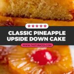 This Pineapple Upside Down Cake is a retro classic featuring a sticky, caramelized pineapple and cherry topping atop an ultra-tender, moist vanilla cake. The recipe uses canned pineapple slices in juice for natural sweetness and incorporates some of the reserved pineapple juice into the cake batter itself for enhanced flavor. Studded with juicy pineapple bits inside, this delightful dessert is perfect for gatherings, serving 10 to 12 people.