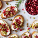 - Add Toppings: Carefully top each goat cheese–covered crostini with a generous amount of pomegranate arils and sprinkle with chopped pistachios, adding a burst of color and texture to the appetizer.