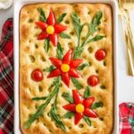 Poinsettia Focaccia Bread is a festive, visually stunning bread shaped like poinsettia flowers using red bell peppers and yellow cherry tomatoes. This savory focaccia is infused with rosemary and olive oil, offering a flavorful and aromatic experience that’s perfect for holiday gatherings or special occasions. Easy to make with simple ingredients, it features a tender dough that rises and bakes into a golden crust, decorated creatively to impress your guests.