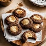 These Pumpkin Cheesecake Cookies are moist and chewy with a luscious cream cheese center. Infused with warming fall spices like cinnamon, nutmeg, cloves, and ginger, and enriched with browned butter for a nutty depth, these cookies are perfect for autumn gatherings. The contrast of the spiced pumpkin dough and the smooth, sweet cheesecake filling makes each bite irresistibly delightful.