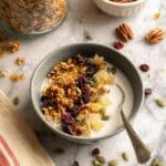 This Pumpkin Granola Recipe offers a deliciously crunchy and nutritious breakfast or snack option, perfectly balanced with warm pumpkin spice flavors, nuts, seeds, and natural sweetness from maple syrup and dried cranberries. It’s an easy-to-make baked granola that features toasted oats and quinoa for extra texture and protein, ideal for fall or any time you crave a cozy, wholesome treat.