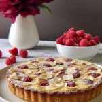 This Raspberry Almond Frangipane Tart is a classic French pastry featuring a buttery almond filling nestled in a crisp almond sablé tart shell, layered with vibrant raspberry preserves and topped with fresh raspberries and sliced almonds. The frangipane filling, made with almond flour, sugar, butter, egg yolks, and a touch of almond extract, bakes to a luscious, nutty custard that perfectly complements the tartness of raspberries. Ideal for an elegant dessert or special occasion, this tart combines textures and flavors for a deliciously sophisticated treat.