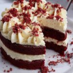 A classic indulgent red velvet cake featuring a moist, tender crumb with a hint of cocoa, enhanced by vibrant red food coloring, and layered with a rich, creamy full-fat cream cheese frosting. Perfect for celebrations or anytime you crave a decadent dessert.