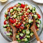 - Mix ingredients: In a large bowl, combine the diced cucumbers, tomatoes, red onion, and chickpeas.