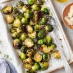 This easy and delicious recipe for roasted Brussels sprouts delivers tender, golden-brown veggies with a bright finish of lemon, Parmesan, and fresh herbs. Perfect as a flavorful holiday side dish or a simple weeknight vegetable, these roasted Brussels sprouts are seasoned with olive oil, sea salt, black pepper, and finished with fresh lemon juice, zest, Parmesan cheese, thyme, parsley, and a pinch of red pepper flakes for a subtle kick.