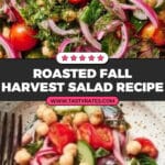 A vibrant and hearty Roasted Fall Harvest Salad featuring crispy spiced chickpeas, tender roasted honeynut squash, fluffy quinoa, and massaged kale, all tossed with a creamy maple tahini dressing. Perfectly suited for autumn, this salad offers a delightful balance of textures and flavors that make it a wholesome main or a festive side dish.