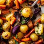 A simple and flavorful recipe for roasted vegetables including potatoes, carrots, parsnip, and red onion, seasoned with garlic, thyme, sage, and parsley. Perfectly roasted in olive oil to bring out natural sweetness and a delicious caramelized texture.