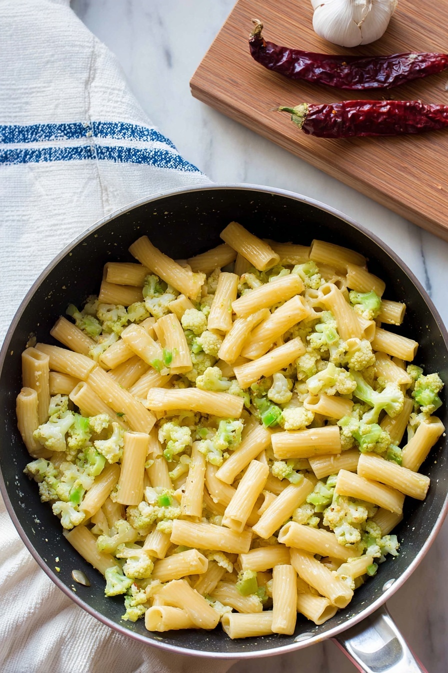 Add the blanched Romanesco florets to the infused oil, tossing gently to coat them well. Season with a pinch of salt and freshly cracked pepper. Now, here’s a trick I discovered: use a wooden spoon or fork to gently mash some of the florets right in the pan, then add a splash of the reserved boiling water to loosen everything up into a silky, creamy sauce. I usually cook this mixture for about 5 to 10 minutes, stirring often. This step helps the flavors meld together beautifully and creates that lovely sauce that clings to the pasta.