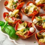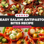 Salami Antipasto Bites are an elegant and easy-to-make appetizer featuring crispy baked salami cups filled with a flavorful mix of marinated artichoke hearts, pimento-stuffed olives, roasted red bell peppers, fresh mozzarella, and basil. Perfect for parties, these bite-sized treats combine tangy, savory, and creamy elements in a convenient finger-food format.