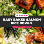 These Salmon and Rice Bowls feature tender, marinated salmon baked to perfection and served over fluffy steamed rice with fresh cucumbers, creamy avocado, and edamame. A spicy mayo drizzle adds a flavorful kick, making this dish a quick, healthy, and satisfying meal perfect for weeknights or casual gatherings.