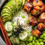 - Assemble the bowls: Divide the steamed rice evenly among bowls. Top each with baked salmon cubes, sliced cucumbers, avocado slices, steamed edamame, and any other desired toppings. Drizzle the spicy mayo over the top and garnish with sesame seeds and nori sheets. Serve immediately for the freshest flavor.