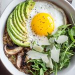 - Assemble and Serve: Divide the savory oatmeal evenly into bowls. Top each with a fried egg, sliced avocado, a handful of baby arugula, and optional shaved parmesan, parsley, and sautéed mushrooms. Serve warm for a nourishing, flavorful meal.