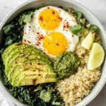 - Assemble Bowl: Start by placing the cooked quinoa as the bowl base. Top with sautéed kale, sliced avocado, halved soft boiled eggs, a spoonful of dairy-free pesto, and optional red pepper flakes for a spicy kick.