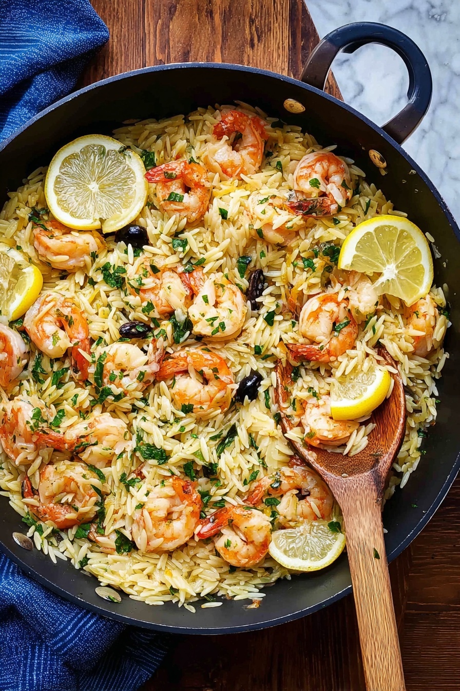 This vibrant Orzo with Shrimp and Feta recipe is a flavorful one-pot Mediterranean-inspired dish featuring succulent shrimp, tender orzo pasta, tangy feta cheese, and briny black olives, all brightened with fresh lemon zest and juice. Perfect for a quick and satisfying weeknight dinner, it combines simple ingredients and bold flavors for a wholesome meal.