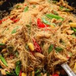 Finally, add your softened rice vermicelli right into the pan, along with the noodle sauce you mixed earlier. Toss everything carefully so the noodles soak up all the flavors and the chicken and veggies distribute evenly. After a minute or two of stirring, it’s ready to serve. Don’t forget to taste and adjust with a little extra soy or sugar if needed!