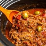 - Shred Meat and Add Final Ingredients: After about 5 1/2 hours, remove the meat from the slow cooker. Using two forks, shred the meat into bite-sized pieces. Return the shredded meat to the slow cooker and stir in the sliced green olives and white vinegar. Continue cooking for an additional 30 minutes to meld the flavors.