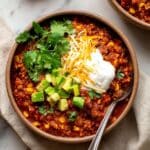 Reheat your chili gently on the stovetop over medium-low heat, stirring occasionally so it warms evenly and doesn’t stick. You can also microwave individual portions—just cover loosely and stir halfway through. Adding a splash of veggie broth while reheating helps restore the perfect chili consistency.