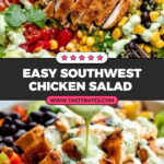 This vibrant Southwest Salad combines spicy seasoned chicken with fresh vegetables, black beans, corn, and creamy guacamole, all topped with a zesty Cilantro Lime Dressing. Perfect for a nutritious and flavorful meal that’s easy to prepare on the stovetop.