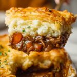 A rich and hearty steak and Guinness pie featuring tender braised beef in a thick, flavorful gravy, topped with creamy sour cream and chive mashed potatoes, cheddar cheese, and a flaky puff pastry crust. Perfect for a comforting meal that combines slow cooking and baking techniques.