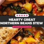 Stewed Great Northern Beans is a hearty and flavorful dish where tender great northern beans are simmered with fresh vegetables, kale, garlic, tomato paste, and aromatic thyme. Perfect for a comforting meal, this stew is finished with sherry vinegar and is delicious served over rice, grits, or alongside toasted buttered ciabatta.