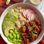 Sticky pineapple chicken is a flavorful and vibrant dish featuring tender chicken thighs cooked in a sticky sweet and sour pineapple sauce. Served over fluffy white rice with fresh edamame beans, crisp radishes, creamy avocado, and a sprinkle of toasted sesame seeds, this recipe offers a delightful blend of textures and tastes that bring a satisfying meal to your table in under 30 minutes.