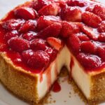 This Strawberry Cheesecake features a buttery biscuit crust and a creamy, light yet rich cream cheese filling. Topped with a luscious homemade strawberry sauce that perfectly complements the smooth cheesecake, this dessert is a delightful treat for any occasion. The recipe balances sweet and tangy flavors, offering a luscious texture that is not as dense as classic New York cheesecake.