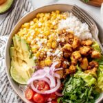 - Assemble the Bowls: Divide the cilantro lime rice among bowls, top with cooked chicken and creamy street corn. Add desired toppings such as lettuce, pico de gallo, onions, jalapeno, diced avocado, and tortilla chips for crunch and extra flavor.