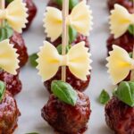 - Assemble skewers: To assemble, thread one piece of bowtie pasta, followed by one fresh basil leaf, then one sauced meatball onto each toothpick or skewer.
