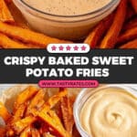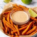 Crispy baked sweet potato fries served with a flavorful chipotle lime dipping sauce. The fries are lightly coated in vegetable oil and seasoned with kosher salt, while the creamy mayo-based dip offers a smoky, tangy complement. Perfect as a tasty side dish or snack that balances sweet, spicy, and savory flavors.