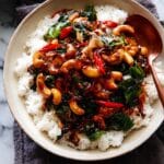 All the ingredients come together beautifully in this Thai Cashew Chicken Stir Fry Recipe, creating that signature balance of salty, sweet, and spicy. A couple of tips—I always use skinless, boneless chicken thighs because they stay juicy and tender, and opting for raw cashews lets you toast them fresh for that unbeatable crunch.